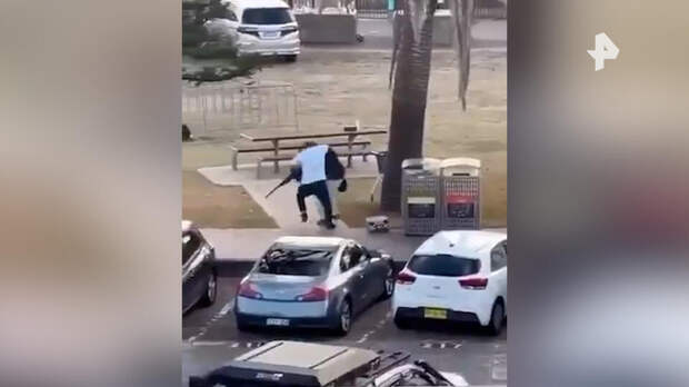 На видео можно заметить, как мужчина подкрадывается к злоумышленнику через парковку и берет в захват стрелка.