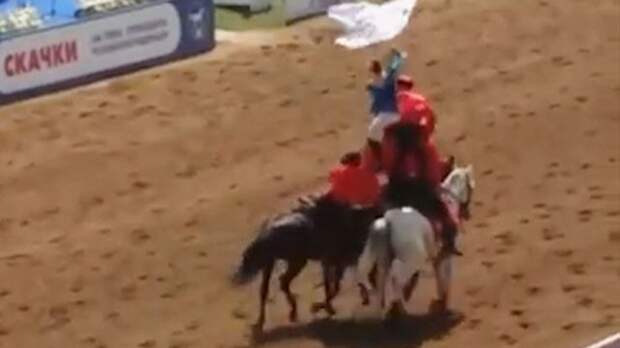 Акробатка упала с 6-метровой высоты во время демонстрации флага на скачках на приз президента. Очевидцы сняли инцидент на видео.