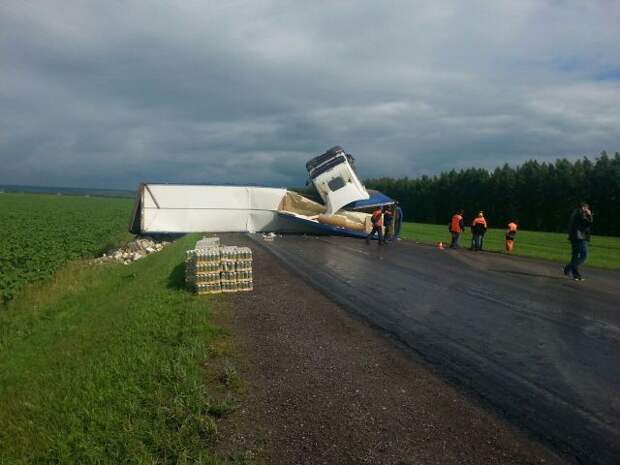 По предварительным данным, водитель фуры, которая перевозила пиво, не справился с управлением и вылетел в кювет.