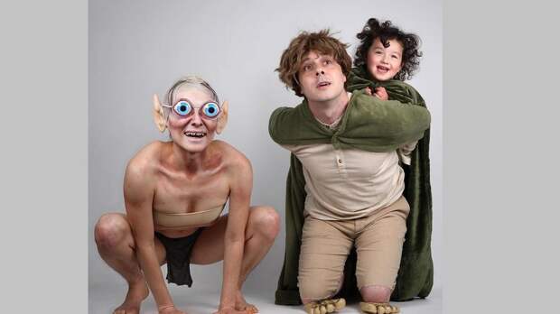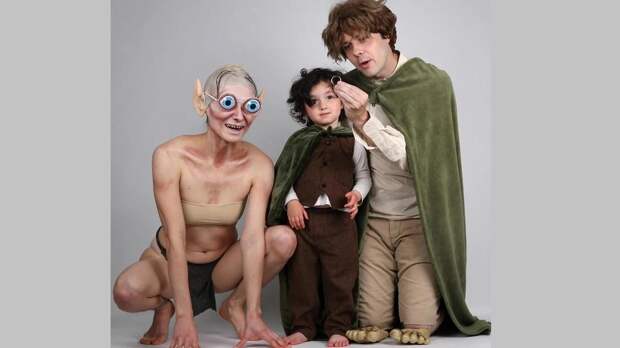 На этих кадрах можно увидеть родителей и ребенка в образах героев английского писателя Джона Толкина. Отец и сын превратились в хоббитов Фродо и Сэма.