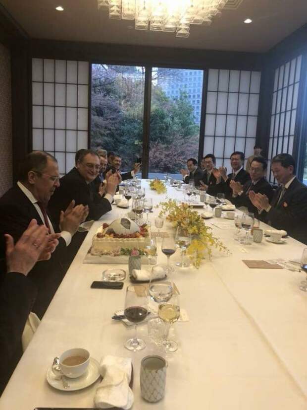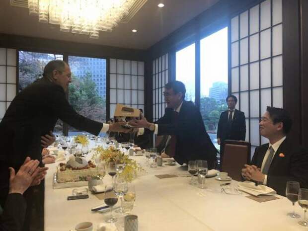 По случаю праздника японский коллега Таро Коно преподнес Лаврову торт в виде футбольного мяча.