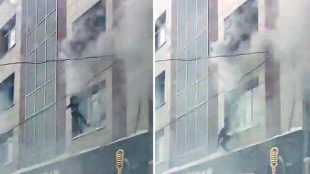 На кадрах видно, пострадавшие выпрыгивают из окон, а очевидцы растягивают одеяла, чтобы их поймать.