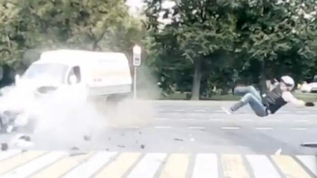 На внушительной скорости мотоцикл врезается в "Газель", и мужчина вылетает из седла на проезжую часть и приземляется на спину.
