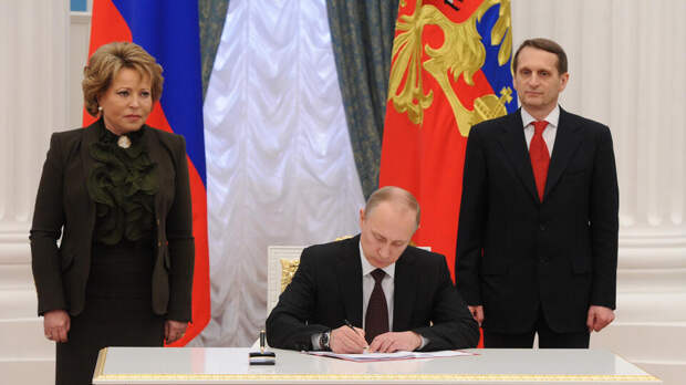 18 марта 2014 года по итогам референдума президент России Владимир Путин, председатель Совета министров Крыма Сергей Аксенов, председатель Государственного совета Крыма Владимир Константинов и глава Севастополя Алексей Чалый подписали договор о вхождении в состав РФ двух новых субъектов Федерации – Республики Крым и города федерального значения Севастополя.