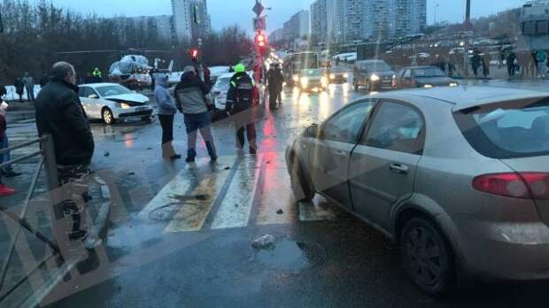 Несколько автомобилей столкнулись у метро Красногвардейская в Москве. Как сообщает пресс-служба Департамента ГОЧСиПБ, в результате пострадали три человека.