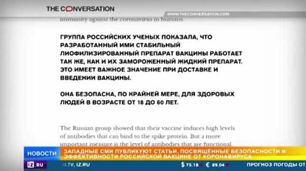 Большую статью по результатам исследований посвятил австралийский журнал Conversaition. И это уже второе авторитетное издание, которое публикует материал о "Спутник V". Ранее это сделал престижный, известный во всём мире британский Lancet.