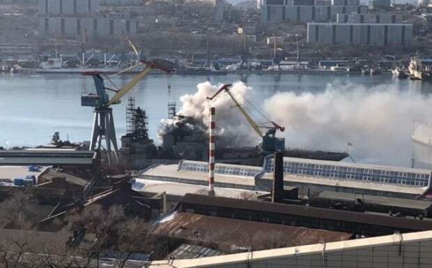 Представители Минобороны РФ рассказали о причинах пожара на большом противолодочном корабле ТОФ "Маршал Шапошников", который находится на судостроительном заводе "Дальзавод".