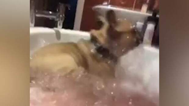 На этих кадрах можно увидеть, как собака неожиданно прыгает к девушке в ванну, полную воды.