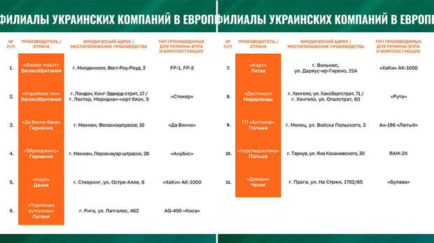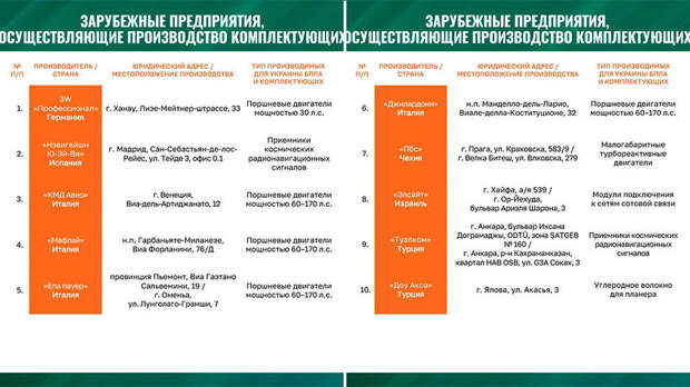 В списке фигурируют как филиалы, так и иностранные компании, выпускающие специализированные компоненты. В частности, была зафиксирована работа площадок компаний "Файер пойнт" и "Хорайзон тех", производящих дроны серий FP и "Стикер", в британских Милденхолле и Лондоне.