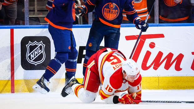 Российский хоккеист "Калгари Флеймз" Никита Задоров ушел от двойного силового приема соперников из "Эдмонтон Ойлерз" в четвертом матче второго раунда плей-офф Кубка Стэнли.