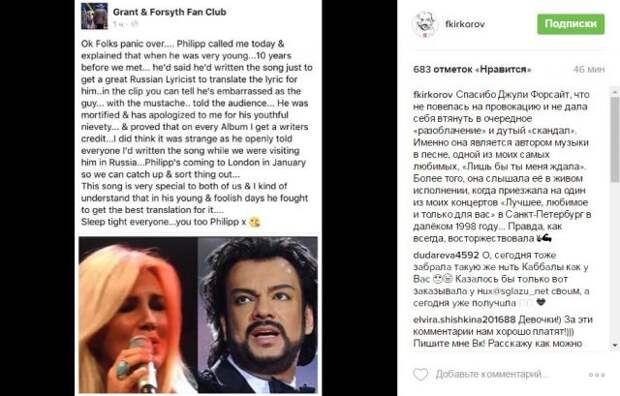 "Спасибо Джули Форсайт, что не повелась на провокацию и не дала себя втянуть в очередное "разоблачение" и дутый "скандал". Именно она является автором музыки в песне, одной из моих самых любимых, "Лишь бы ты меня ждала". Более того, она слышала её в живом исполнении, когда приезжала на один из моих концертов "Лучшее, любимое и только для вас" в Санкт-Петербург в далёком 1998 году... Правда, как всегда, восторжествовала", - написал Киркоров в своем Ibstagram.