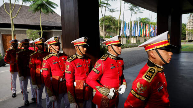 На площадке саммита – оркестр и красная дорожка. У всех кортежей дополнительная индонезийская охрана на мотоциклах с автоматами наперевес.