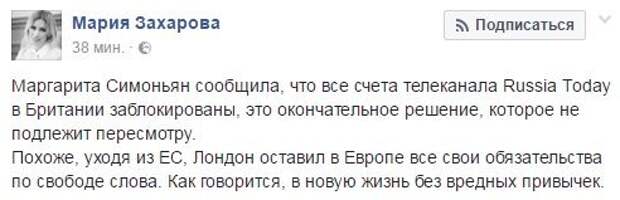 Официальный представитель МИД РФ Мария Захарова прокомментировала сообщение о блокировке счетов телеканала Russia Today в Великобритании. По словам спикера, таким образом Лондон, уходя из ЕС, оставил ему все свои обязательства по свободе слова.