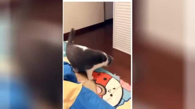 На этих кадрах запечатлено, как хвостатая несет малыша в зубах, а потом прыгает на кровать, но роняет котенка. Детеныш остается на полу, а мать, бросив на него взгляд, как ни в чем не бывало продолжает свой путь.