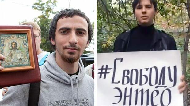 Сторонники православного активиста Дмитрия Цорионова, который более известен по прозвищу Энтео, устроили акцию поддержки у Тверского суда Москвы. Они пришли туда с плакатами "Свободу Энтео". Потом соратники Энтео устроили молебен в самом суде.