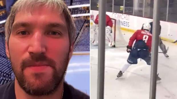 На этих кадрах запечатлено, как во время тренировки Овечкин подхватил отскочившую к нему на пятачке шайбу и броском между ног отправил ее в ворота.
