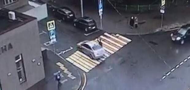 На кадрах видно, что водитель автомобиля не успел притормозить на повороте, а пешеход не заметила приближающегося сзади транспортного средства.