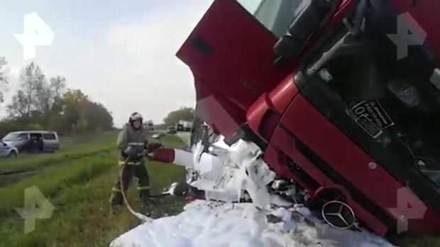 По данным РЕН ТВ, грузовая фура Mercedes столкнулась с легковым автомобилем и перевернулась на бок.