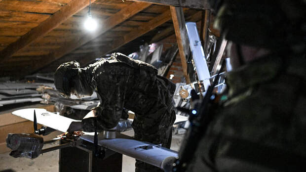 Кадр программы "Итоговая программа с Петром Марченко", РЕН ТВ "Вот еще один вариант нестандартного применения ударных беспилотников. Здесь вместо боевой части установлена дымовая шашка, несколько таких сейчас закинут в лесополосу, по которой должны пройти наши штурмовики", – показал корреспондент.