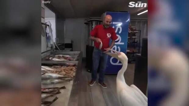 На ролике пеликан смело прогуливается по залу заведения мимо остальных посетителей, останавливается у персонала и получает свою порцию рыбы.