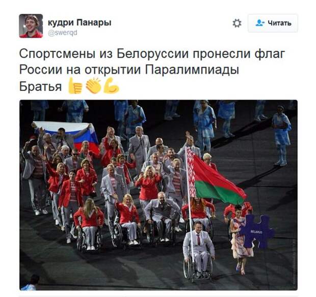 "Спортсмены из Белоруссии пронесли флаг России на открытии Паралимпиады. Братья!" — пишет пользователь Twitter кудри Панары.