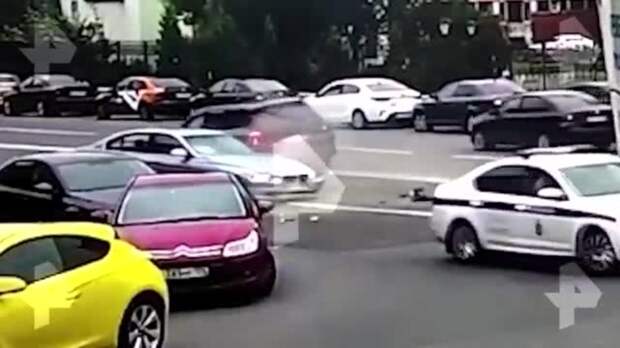 На кадрах видно, как водитель Porsche сначала подрезает одну машину у арки, а затем на большой скорости входит в поворот и врезается в BMW. При этом лихач едва не зацепил служебный автомобиль стражей порядка, которые смогли уйти от столкновения в последний момент.