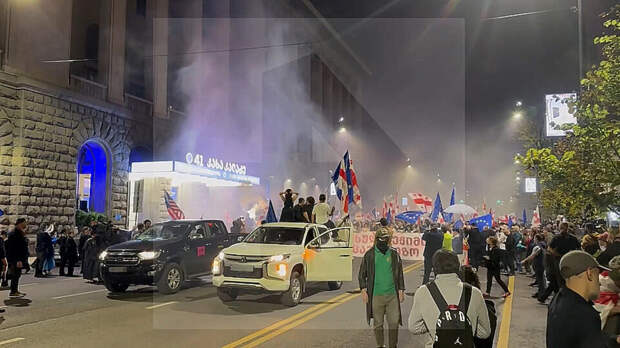 Отмечается, что оппозиционеры с флагами Соединенных Штатов и Евросоюза перекрыли проспект Руставели перед грузинским парламентом.
