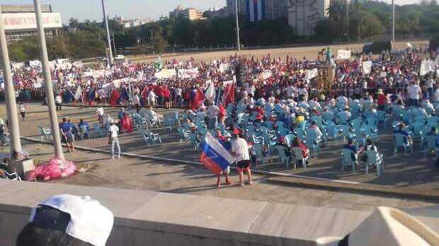 На снимке запечатлены два человека с российским флагом у гостевой трибуны на фоне гаванской Площади Революции, где проходило шествие.