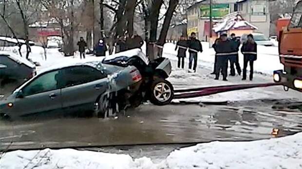 У них никак не получалось это сделать. Тогда на место пригнали КамАЗ. Буквально одним рывком грузовик вырвал у легковушки задние колеса, повредил корпус. Сейчас автомобиль не подлежит восстановлению.