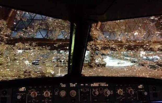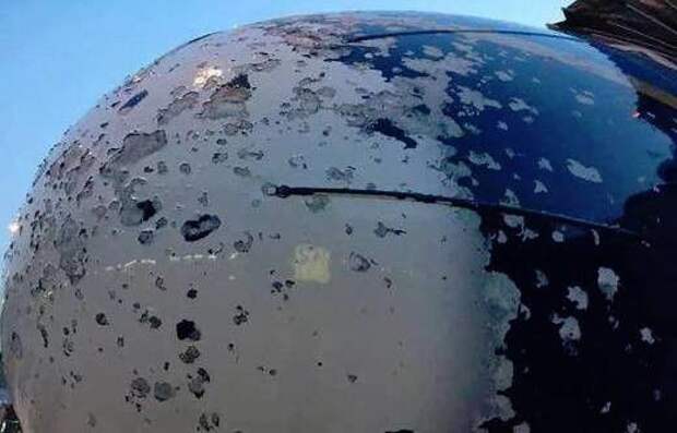 На снимках, выложенных в Сети после полета, видно, что градины буквально изрешетили фюзеляж лайнера, а также повредили стекло в кабине пилота.