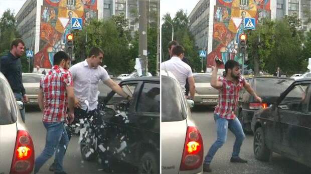 На кадрах видно, как компания неизвестных пассажиров и водитель Renault совершают нападение на дороге. Они отрывают стекло в водительской двери и наносят несколько ударов по владельцу транспортного средства.