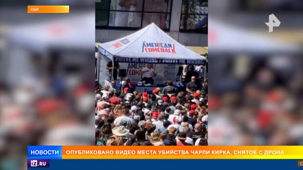 Убитый накануне американский политик Чарли Кирк был противником спонсирования Украины. Его застрелили на глазах у тысяч зрителей прямо во время дебатов. Мотивы до сих пор не ясны, убийца не пойман, но буквально каждый час резонансное преступление обрастает новыми подробностями. Появились кадры с дрона, на них можно в деталях рассмотреть трибуну, с которой выступал Кирк, и предполагаемую точку расположения его убийцы.