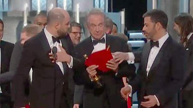 Актер смутился и передал записку своей напарнице Фэй Данауэй, которая и объявила победителем мюзикл Дэмьена Шазелла.Всего несколько минут спустя выяснилось, что настоящим победителем стал фильм "Лунный свет", а первый конверт попал в руки Уоррена Битти по ошибке.