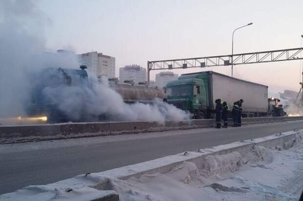 Как сообщают местные СМИ, в топливопроводе грузовика замерзло дизельное топливо. Кроме того, ледяная хватка сковала тормоза полуприцепа, из-за чего фуру длительное время не получалось сдвинуть с места.