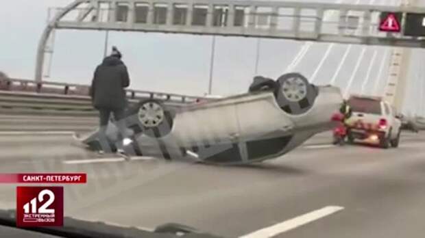 В Санкт-Петербурге на Вантовом мосту перевернулся автомобиль.