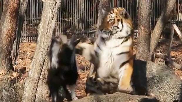 На записи видно, как тигр Амур дал оплеуху своему заигравшемуся другу. На видео запечатлено, что так хищник отреагировал на то, что козел Тимур подошел слишком близко и сделал выпад в сторону тигра.