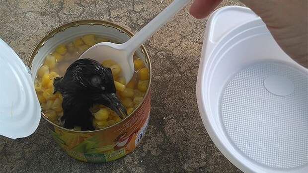Ранее пользователи Сети опубликовали фото открытой банки консервированной кукурузы, в которой лежит голова голубя.