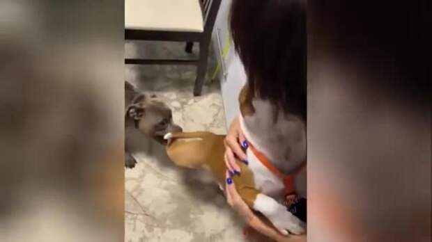 На этих кадрах запечатлено, как четвероногая застает свою хвостатую сестру в объятиях хозяйки. Ревнивой собаке явно это не нравится, и она начинает оттаскивать ее за заднюю лапку. При этом вторая собака не намерена так просто отпускать хозяйку – она лижет девушке лицо и виляет хвостом.