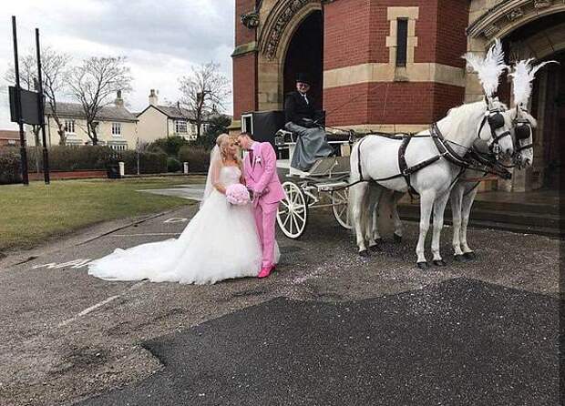 Жених щеголял в элегантном костюме нежно-розового цвета, а церковь, в которой проходила церемония, была украшена несколькими фотографиями любимого хряка Лии.