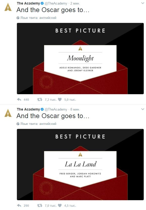 Сразу после объявления "Ла-ла Лэнд" победителем, стало известно, что победу в номинации на самом деле одержал фильм "Лунный свет". Ошибку допустил Уоррен Битти.