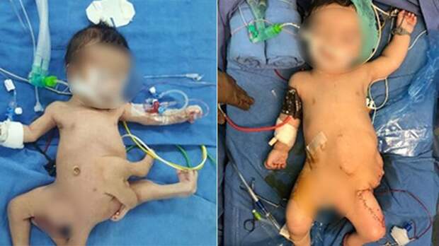 Иракскому новорожденному мальчику в Индии сделали операцию по удалению лишних рук и ног, которые появились в результате слияния с несформированным сиамским близнецом. Об этом сообщает Daily Mail.