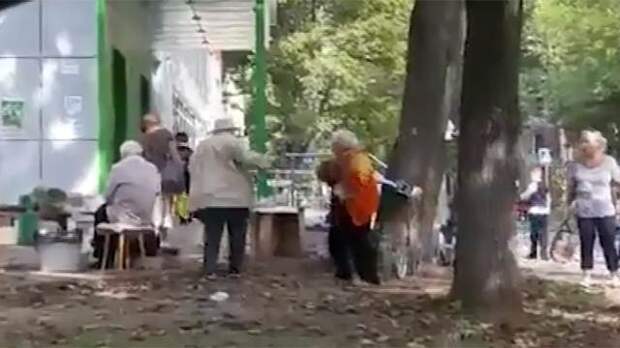 В ход идут все подручные средства. Одна из старушек нападает на соперницу с тростью и со всей силы лупит по спине. Но и та может за себя постоять — хватает и бьет обидчицу.