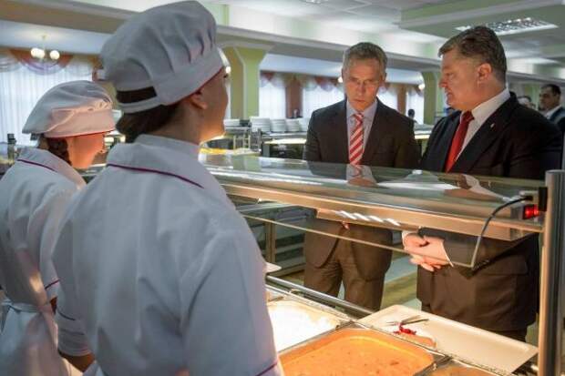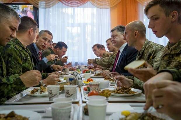 На фото, размещенных украинским президентом в Facebook, Столтенберг явно огорчен скудным выбором в военном пищеблоке.