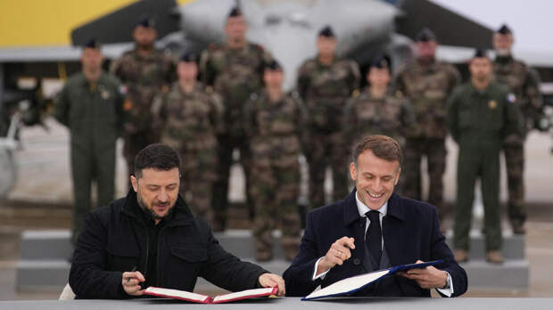 Christophe Ena/Pool via REUTERS Президент Франции Эммануэль Макрон и глава киевского режима Владимир Зеленский 17 ноября подписали соглашение о поставках военной техники на Украину. Прямую трансляцию с авиабазы Виллакубле в парижском регионе вел телеканал LCI.