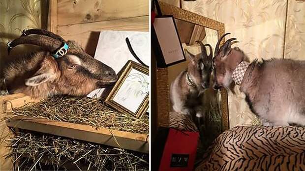"Как у каждой породистой москвички, у неё есть любовь к "цацкам". Вот ошейник Луи Витон, кольцо на ногах Шанель. У неё, конечно, немецкие корни. Она так с акцентом, с акцентом говорит", - рассказал хозяин козы.