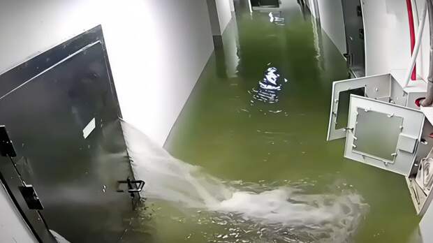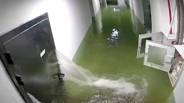 На видео запечатлено, как вода заполнила коридоры "по пояс", выбив металлическую дверь, и практически полностью заливает помещения.