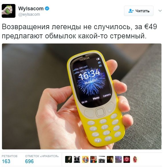 "Если змейка ("Змейка" – популярная мобильная игра на Nokia. – Прим. РЕН ТВ) есть, простим", – пишет один из комментаторов в "Твиттере".