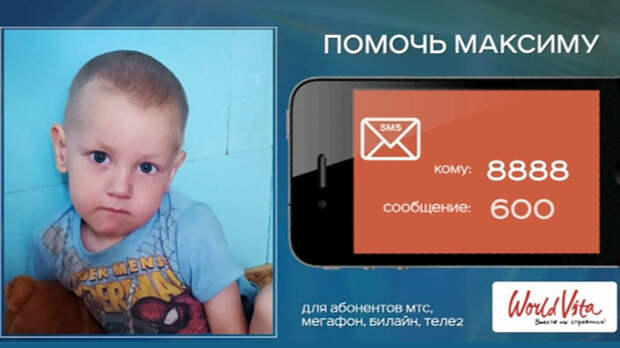Максиму нужно очень дорогое лечение. Зрителям РЕН ТВ почти удалось собрать эту гигантскую сумму. Осталось совсем чуть-чуть.Помочь очень просто — достаточно отправить СМС на короткий номер 8888. В тексте указать любую сумму. Можно воспользоваться банковской картой или сделать онлайн-перевод. Все инструкции на сайте World Vita.