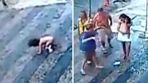 На кадрах видно, как маленький мальчик падает на асфальт. Кажется, что он умер, либо получил тяжелые травмы.