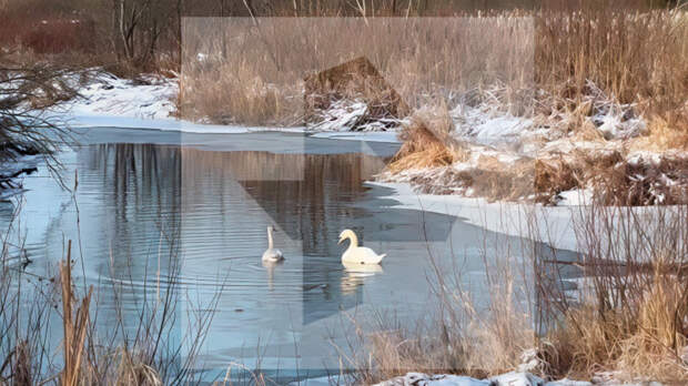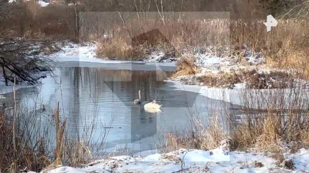 На кадрах видно, что два лебедя – белый и серый – находятся на воде, несмотря на то, что по берегам уже лежит снег.